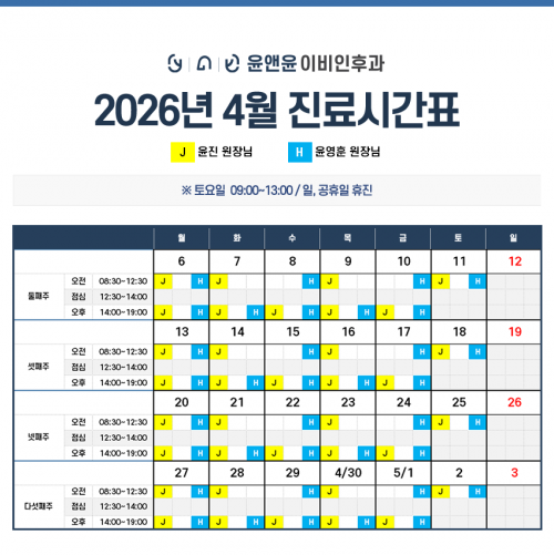 윤앤윤 이비인후과는 의료진 전원이 대학병원 교수 출신으로 구성되어 있습니다. 오랜 시간 축적된 경험과 노하우를 바탕으로 대전 시민분들께 최선의 진료를 제공해드리기 위해 노력하겠습니다.